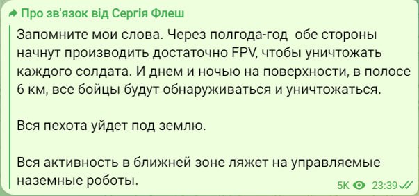 «И днем, и ночью на поверхности, в полосе 6 км, все бойцы будут обнаруживаться и уничтожаться. Вся пехота уйдет под землю. Вся активность в ближней зоне ляжет на управляемые наземные роботы», – написал он.