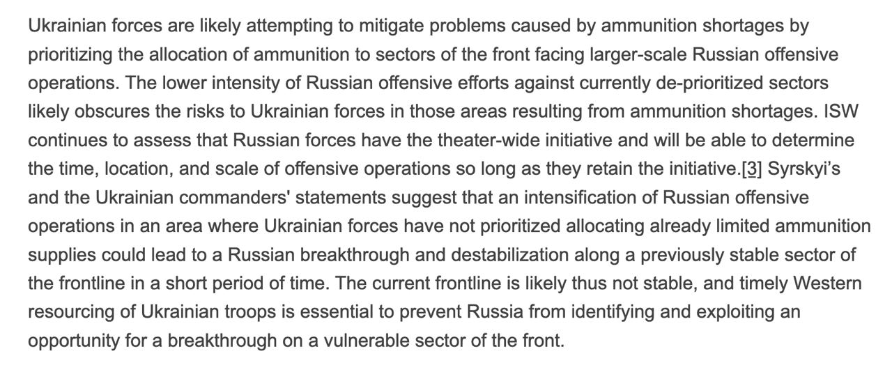 Аналитики считают, что нынешняя линия фронта, "скорее всего, нестабильна", и важно снабдить Украину снарядами, "чтобы не дать России выявить и использовать возможность прорыва на уязвимом участке фронта".