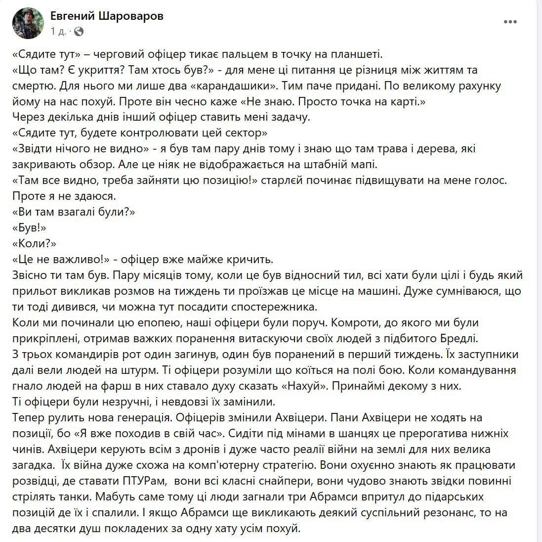 Военный, пишущий в Фейсбуке под именем Евгений Шароваров, заявляет, что новое пополнение командиров отправляет солдат на позиции, которые не подготовлены для обороны и ведут к высоким потерям.