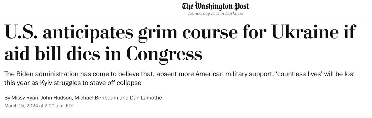 "Это не принесет Украине ничего хорошего в течение долгого времени без поставок и может привести к потенциальному краху. Но вот в чем суть: даже если Украина удержится, то для этого нам придется пожертвовать бесчисленными жизнями", - заявил высокопоставленный американский чиновник.