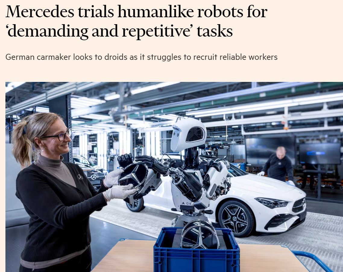 "Это одно из первых применений роботов , имеющих человеческий облик. Они позволяют автопроизводителям повысить степень автоматизации заводов без внесения дорогостоящих изменений в их планировку, поскольку роботы могут перемещаться по пространствам, предназначенным для людей", - говорится в статье.