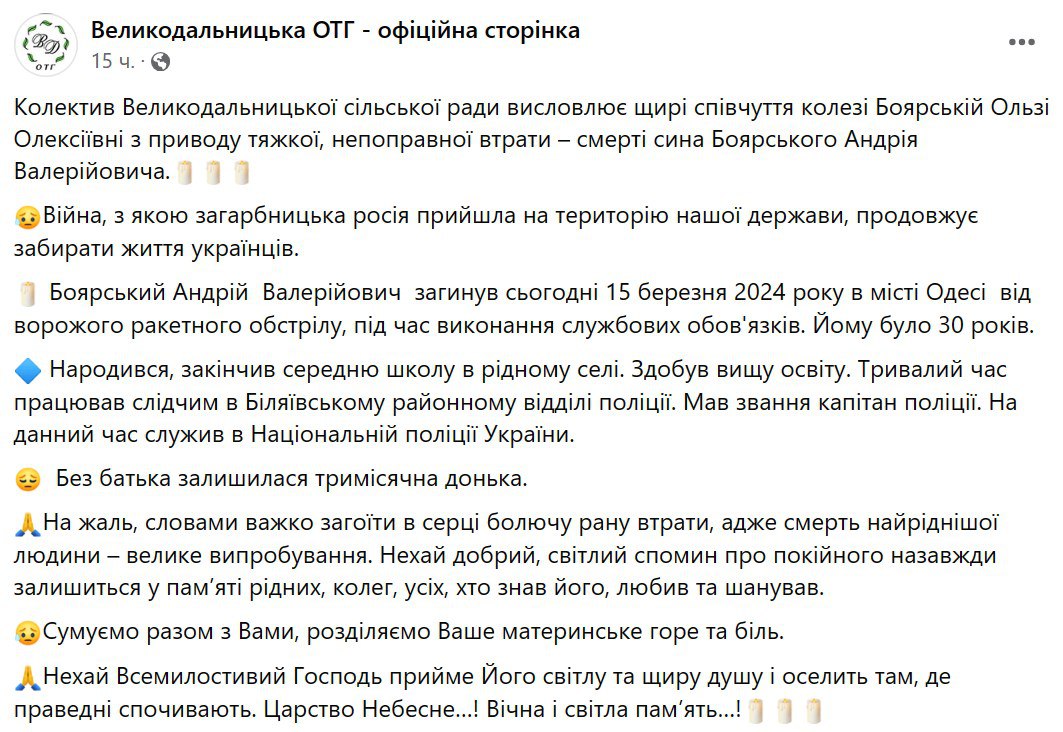Также во время вчерашнего удара по Одессе погиб еще один полицейский - 30-летний капитан Андрей Боярский.