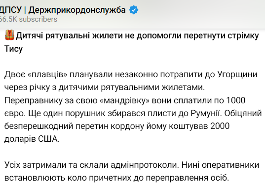 "Двое "пловцов" планировали незаконно попасть в Венгрию через реку, используя детские спасательные жилеты. Переправителю за свое путешествие они заплатили по 1000 евро", – сказано в сообщении.