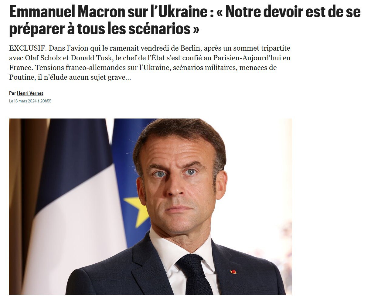 "Возможно, в какой-то момент - я этого не желаю, не буду брать на себя инициативу - потребуются наземные операции, какими бы они ни были, для противодействия российским силам. Сила Франции в том, что мы можем это сделать. Наша обязанность - подготовиться ко всем сценариям. Не делать это было бы ошибкой", - сказал Макрон.