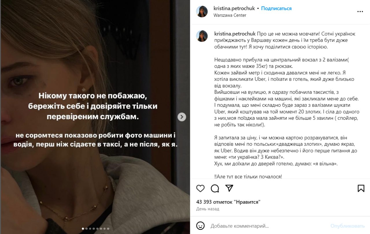 Как сообщила Кристина Петрочук, она приехала из Украины на центральный вокзал в Варшаве и договорилась с таксистом на паркинге о поездке. Он привез ее в гостиницу, но вместо ранее озвученных 20 злотых (около 200 гривен) сказал платить 300.