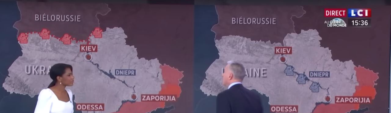 На карте показаны два гипотетические сценария - размещение военных вдоль Днепра и вдоль границы с Беларусью. Судя по всему, сценарии эти составил полковник Винсент Арбаретье, которого пригласили в студию в качестве эксперта.