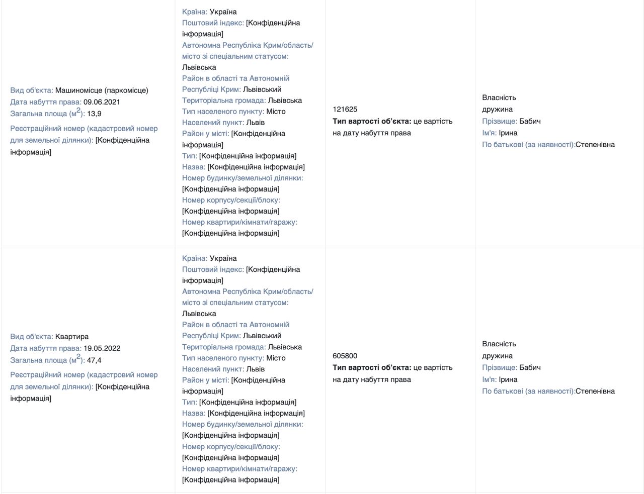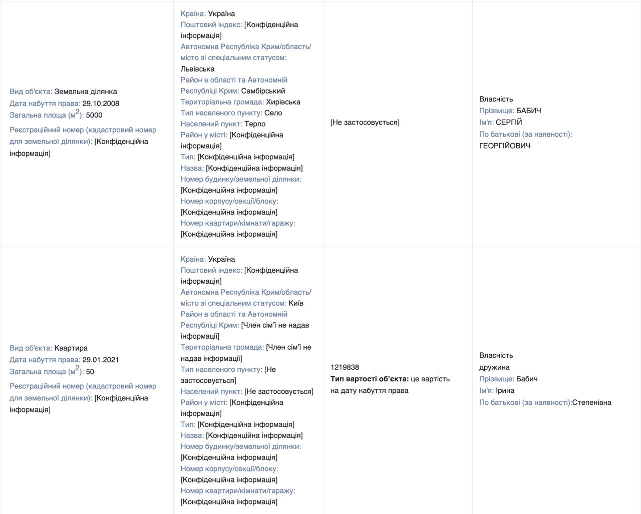 В собственности самого Бабича числятся только два земельных участка. Два жилых дома и земельный участок во Львовской области он переписал на свою дочь-студентку.