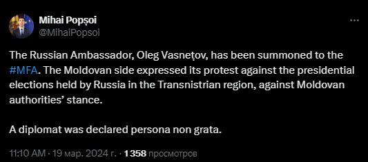 "Молдавская сторона выразила протест против президентских выборов, проведенных Россией в Приднестровском регионе вопреки позиции молдавских властей. Дипломат был объявлен персоной нон грата", - сказано в публикации министра.