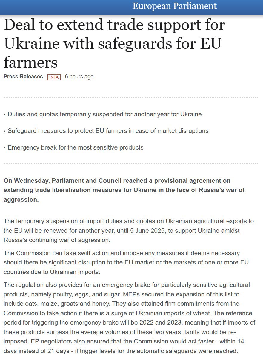 А именно - "любые меры, которые сочтет необходимыми, если произойдет значительный сбой на рынке ЕС или рынках одной или нескольких стран ЕС из-за украинского импорта".