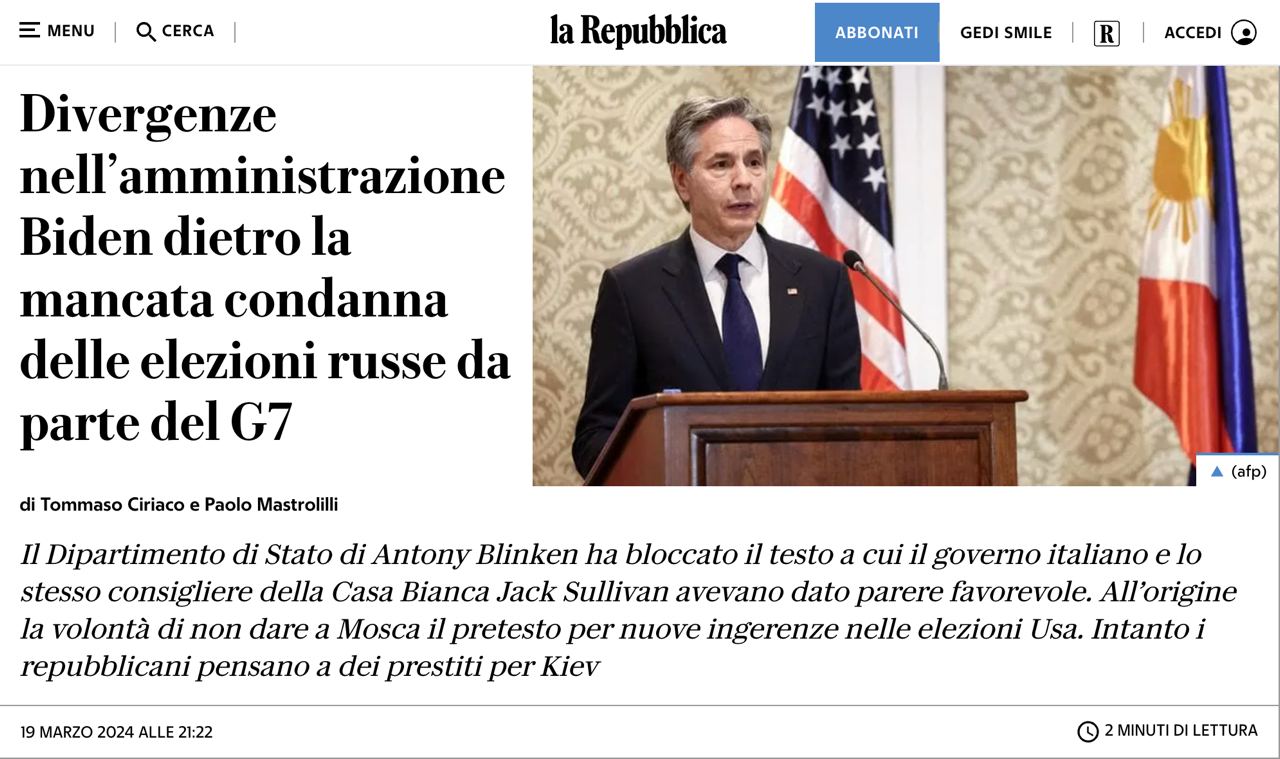 Госсекретарь США Энтони Блинкен заблокировал текст заявления G7 с осуждением выборов Путина в РФ.