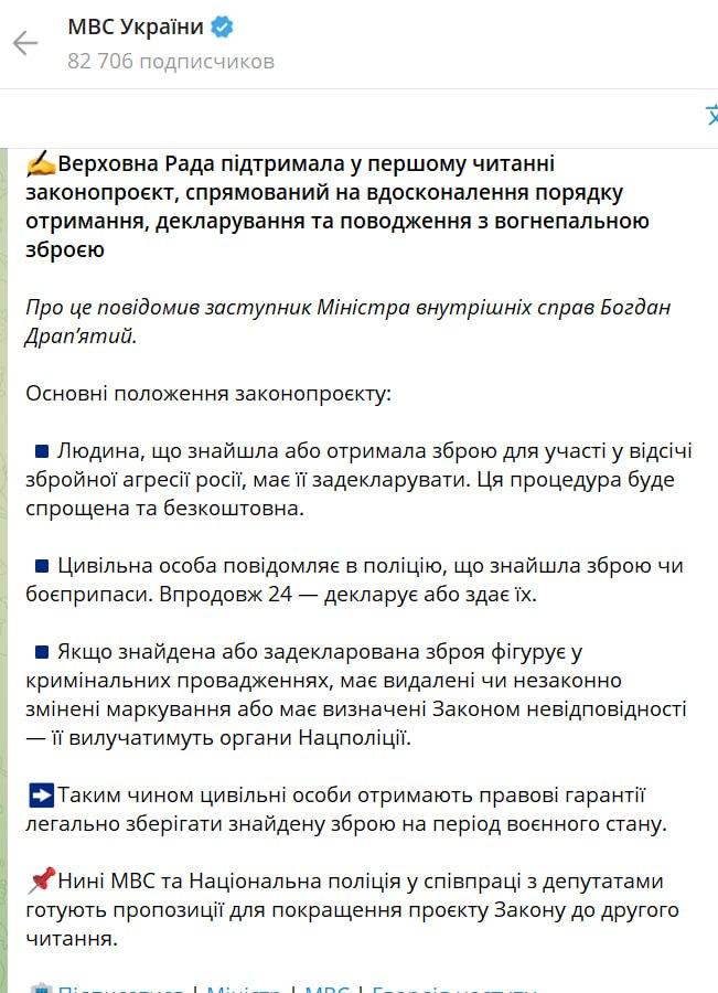 Таким образом, гражданские лица получат правовые гарантии легально хранить найденное оружие на период военного положения.