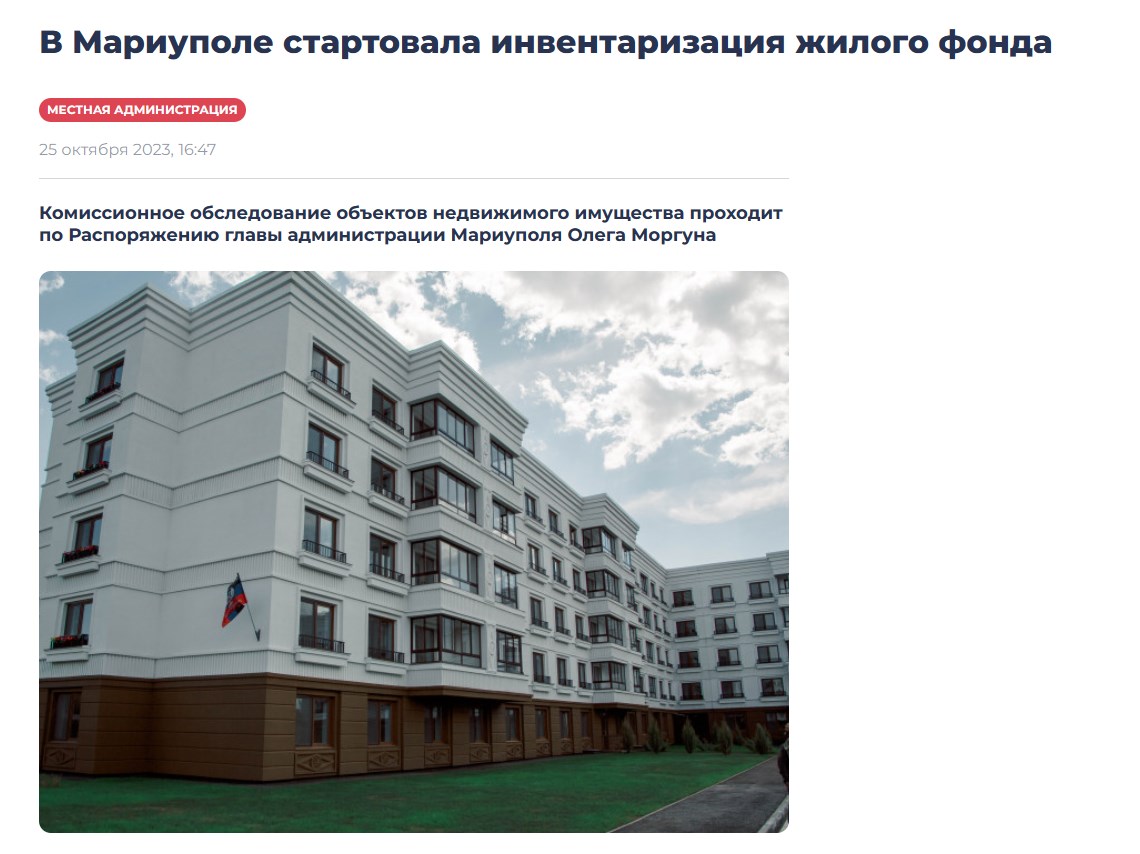 Украинские же власти заявляют о другой проблеме - отъеме жилья у тех, кто долго отсутствует в городе. Если в квартире или доме не проживают 2-3 месяца, то россияне создают "комиссию", которая признает помещение бесхозным и отправляет в собственность "ДНР", сообщал депутат Мариупольского районного совета Дмитрий Забавин.