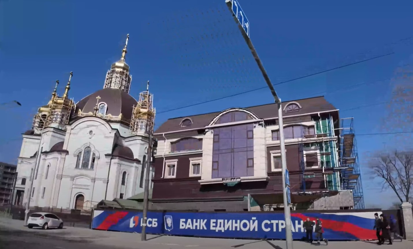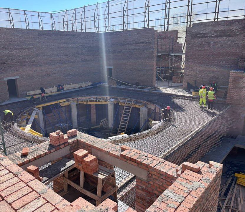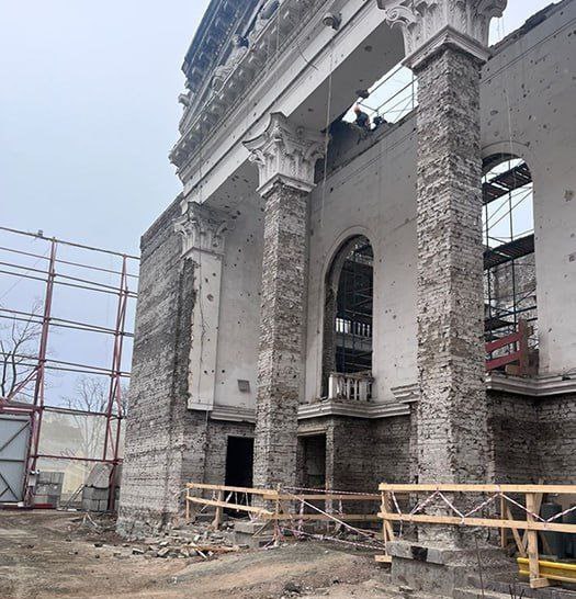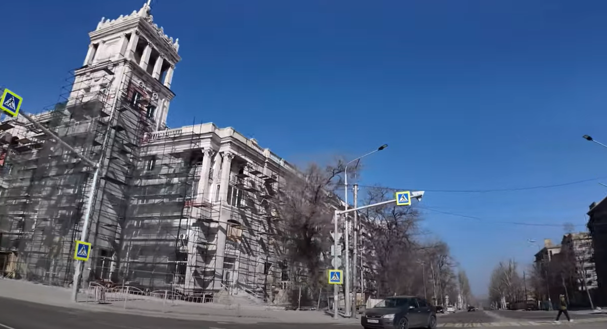 Россияне продолжают реконструировать многострадальный Драмтеатр, разрушенный, как заявляет Украина, ударом российской авиабомбы.