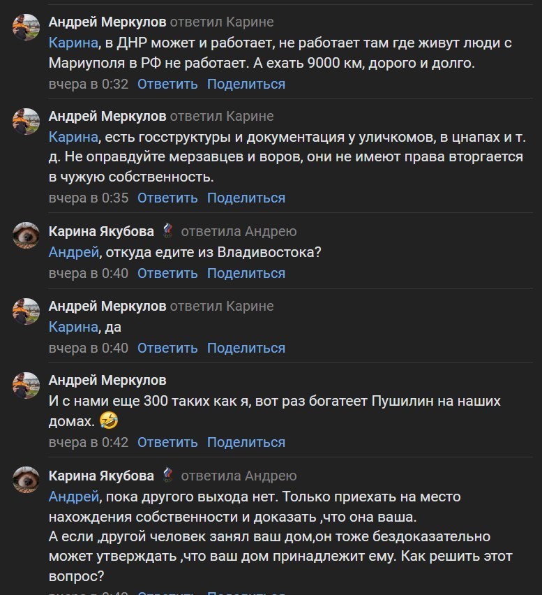 Необходимость такого возвращения подтверждается и в местных пабликах, где люди спрашивают, нужно ли им из Владивостока возвращаться в Мариуполь - что составляет почти 9000 километров и стоит недешево.