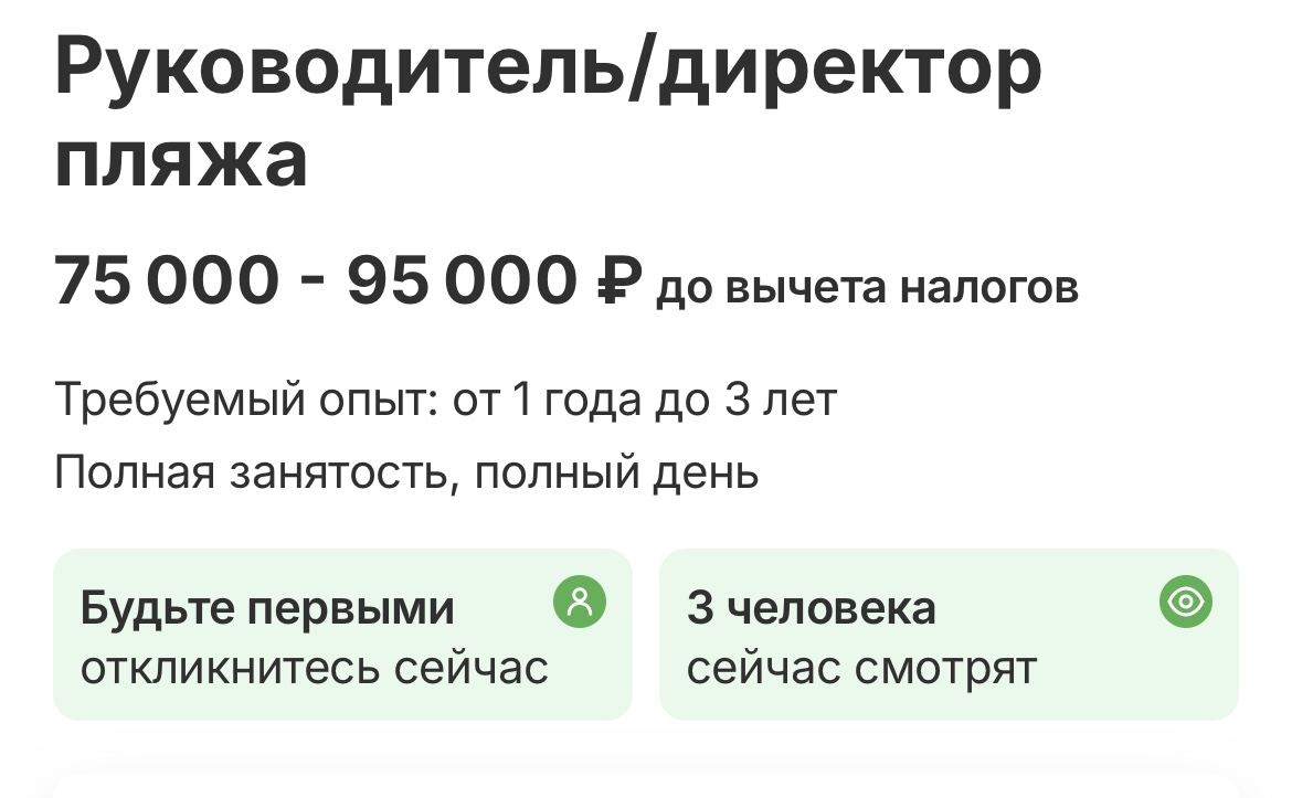 Руководителю пляжа предлагают от 75 000 рублей до вычета налогов (809 долларов). Администратору базы отдыха предлагают от 80 000 рублей на руки (863 доллара).