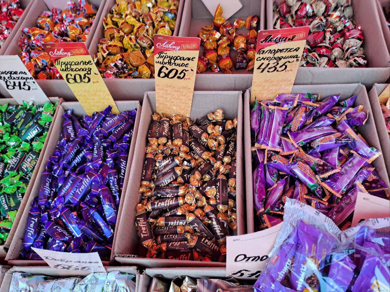Килограмм шоколадных конфет в Мариуполе - 605 рублей (255 гривен). В Киеве похожие конфеты "Свиточ Львовский трюфель" - 360 гривен за кило.