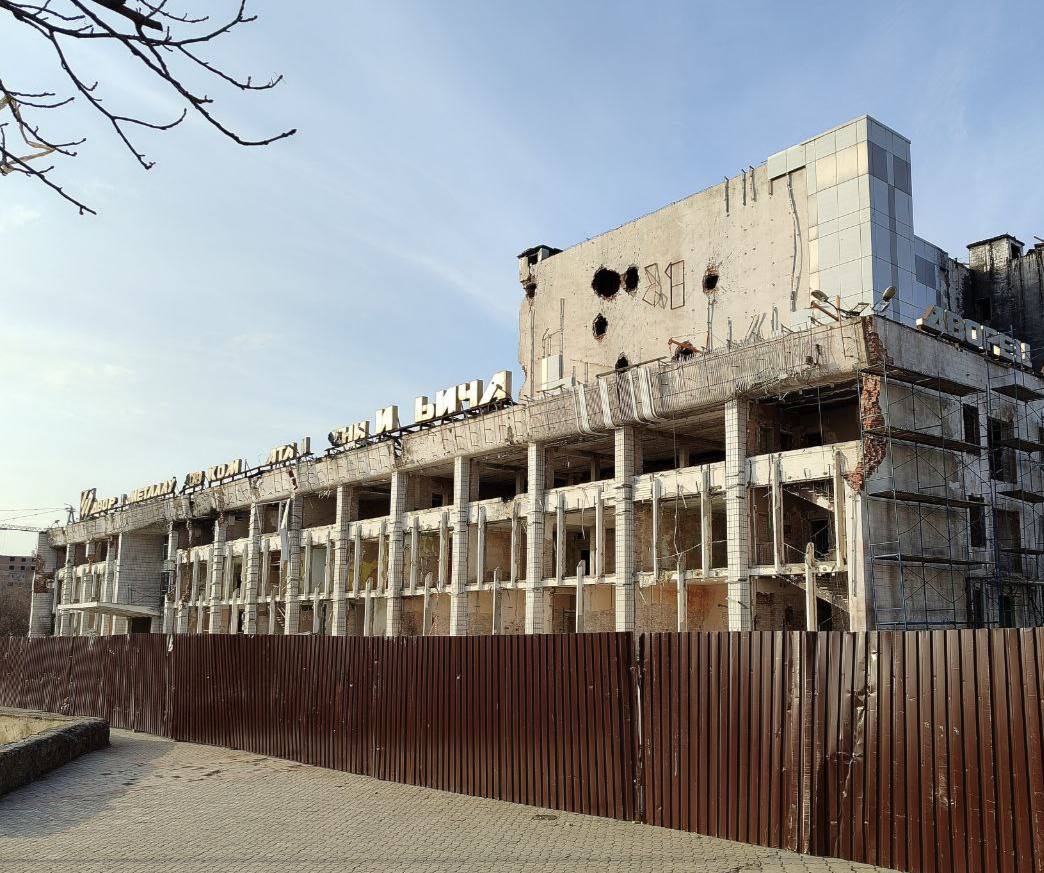 Часть домов продолжают стоять в строительных лесах или с зияющими от обстрелов дырами, в том числе, например, Центральный рынок и ДК Металлургов.