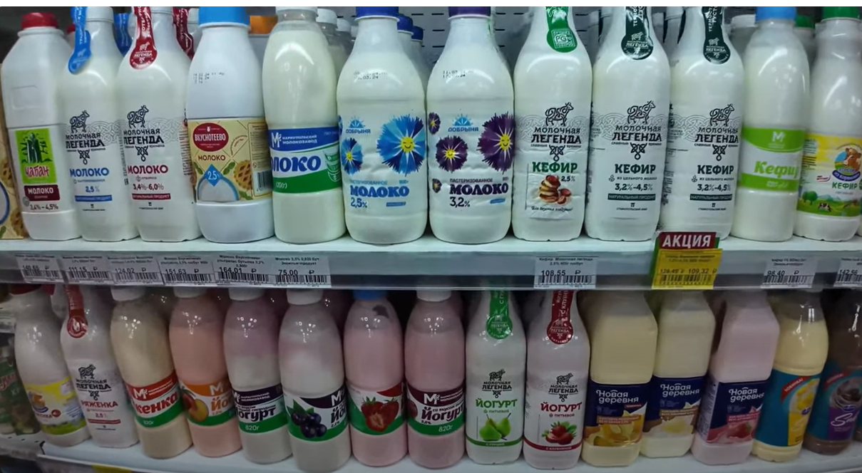 Бутылка дешевого молока в Мариуполе стоит 75 рублей (31 гривна), кефир по акции - 109 рублей (46 гривен).