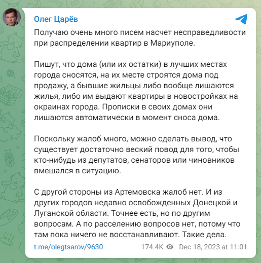"Получаю очень много писем насчёт несправедливости при распределении квартир в Мариуполе. Пишут, что дома (или их остатки) в лучших местах города сносятся, на их месте строятся дома под продажу, а бывшие жильцы либо вообще лишаются жилья, либо им выдают квартиры в новостройках на окраинах города. Прописки в своих домах они лишаются автоматически в момент сноса дома", - написал Царев в своем телеграм-канале.