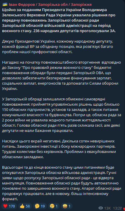 Федоров напомнил, что еще в начале полномасштабного вторжения в соответствии с законом "О правовом режиме военного положения" бюджетные полномочия облсовета были переданы Запорожской ОВА, "что позволило обеспечить непрерывное финансирование зарплат, социальных выплат, энергоносителей и помогать Силам обороны Украины". При этом у Запорожского облсовета оставались ограниченные полномочия: принятие управленческих решений относительно около 150 областных предприятий, учреждений и ведомств, а также вопросы коммунальной собственности и строительства.