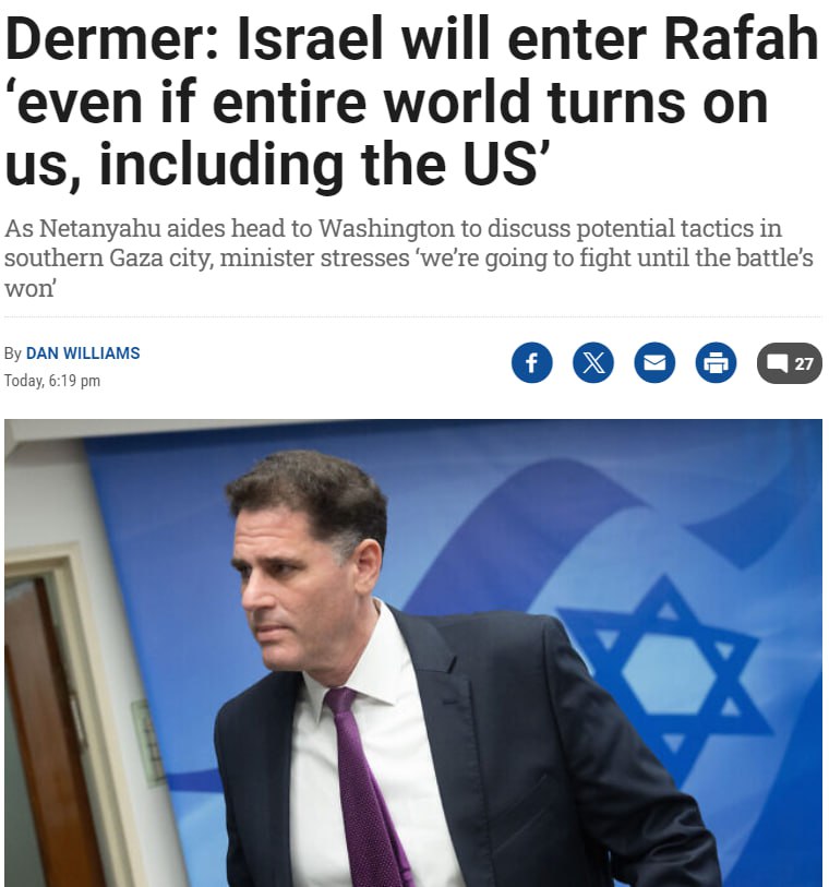 Однако Рон Дермер заявил, что Израиль выслушает американские идеи относительно Рафаха, но город на границе сектора Газа с Египтом будет взят независимо от того, достигнут ли союзники соглашения.