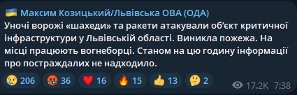 Глава Львовской ОВА Максим Козицкий сообщил, что под ракетный удар попал объект критической инфраструктуры.