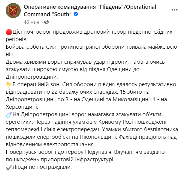 В операционной зоне Сил обороны юга удалось результативно отработать по 22 баражирующих снарядах: 15 сбито на Днепропетровщине, по 3 - в Одесской и Николаевской, 1 - в Херсонской области" - говорится в сообщении.