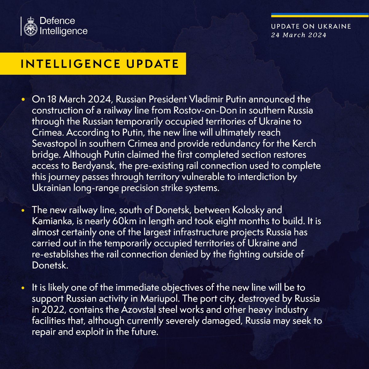 Владимир Путин 18 марта объявил о планах построить железнодорожную ветвь от Ростова-на-Дону на юге России через временно оккупированные территории Украины в Крыму. По его утверждению, первый участок железной дороги восстанавливает доступ в Бердянск.