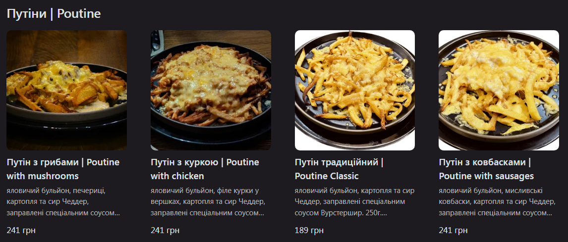 Также это заведение предлагает своим посетителям стейк "Дарья Дугина", сэндвич "Навальный" и отдельный вид блюд "Путины" ("Путин с курицей", "Путин с грибами" и др.).