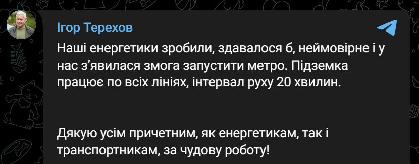 "Наши энергетики сделали, казалось бы, невероятное, и у нас появилась возможность запустить метро. Подземка работает по всем линиям, интервал движения 20 минут", - написал эр Харькова и поблагодарил энергетиков и транспортников за отличную работу.