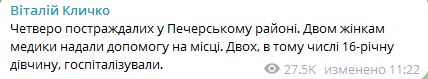 В настоящее время известно уже о четырех пострадавших в Печерском районе. Двум женщинам медики оказали помощь на месте. Двоих, в том числе 16-летнюю девушку, госпитализировали.