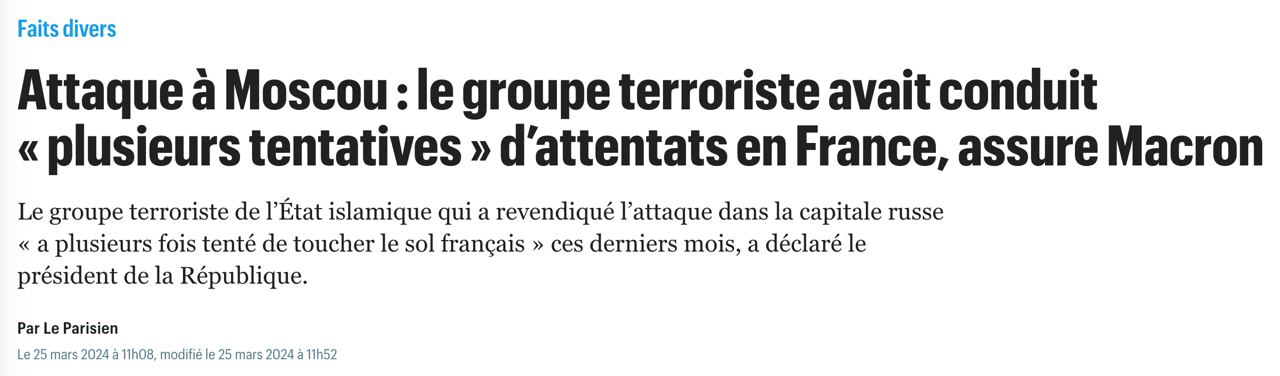Кроме того, он заявил, что группировка ИГИЛ "Вилаят Хорасан", взявшая на себя ответственность за нападение в РФ, за последние месяцы предпринимала несколько попыток покушений на территории Франции, Германии и других европейских стран. Особенно активно она действовала в конце 2022 года.