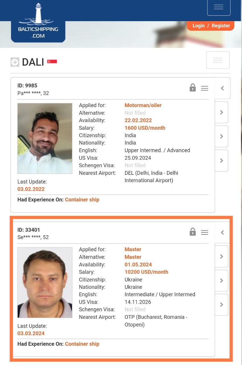 "Последний известный контракт: капитан, контейнеровоз, подписание 19 февраля 2024 года", – пишет портал. Также сообщается зарплата предположительного капитана – 10 200 долларов.