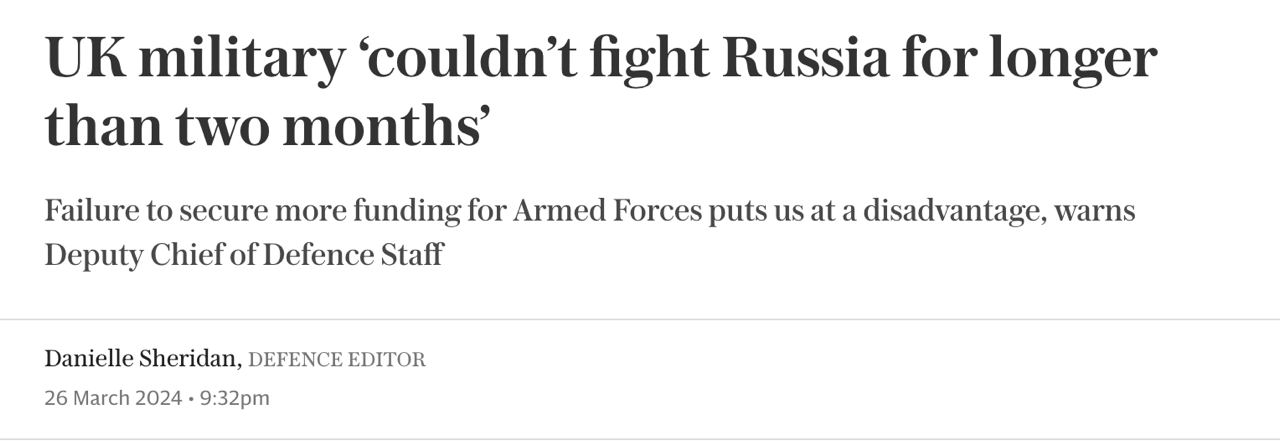 12.50 Британские военные "не смогут воевать с Россией дольше двух месяцев", заявил замглавы штаба обороны королевства Роб Магован, передает The Telegraph.
