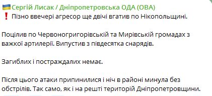 07.35 Поздним вечером силы РФ дважды ударили по Никопольскому району Днепропетровской области.
