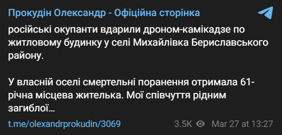"Российские оккупанты ударили дроном-камикадзе по жилому дому в селе Михайловка Бериславского района. В собственном доме смертельные ранения получила 61-летняя местная жительница", - написал он.