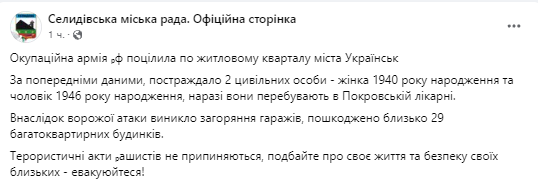 "По предварительным данным, пострадали 2 гражданских лица - женщина 1940 года рождения и мужчина 1946 года рождения, в настоящее время они находятся в Покровской больнице" - говорится в сообщении.