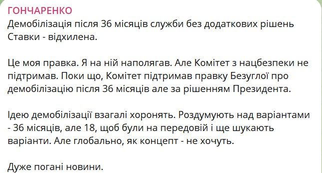 "Размышляют над вариантами – 36 месяцев, но 18 чтобы были на передовой, и еще ищут варианты. Но глобально, как концепт – не хотят", – считает Гончаренко.