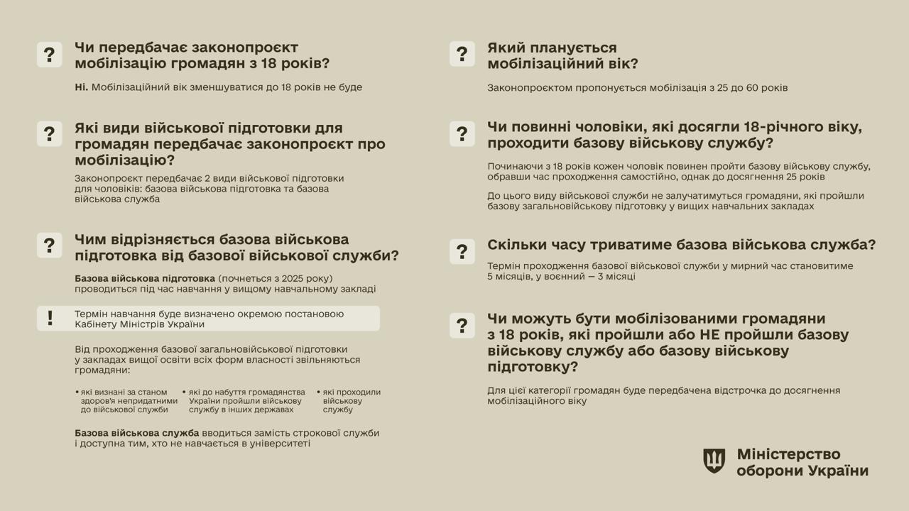 Ранее о том, что после базовой подготовки по новому законопроекту можно будет мобилизовать человека уже с 18 лет, заявлял нардеп Дмитрий Разумков.