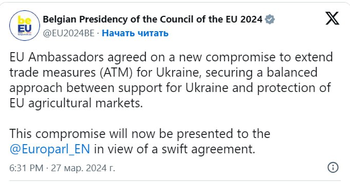 "Послы ЕС согласовали новый компромисс о продлении торговых мер для Украины, который обеспечивает сбалансированный подход между поддержкой Украины и защитой сельскохозяйственных рынков ЕС", – говорится в сообщении.