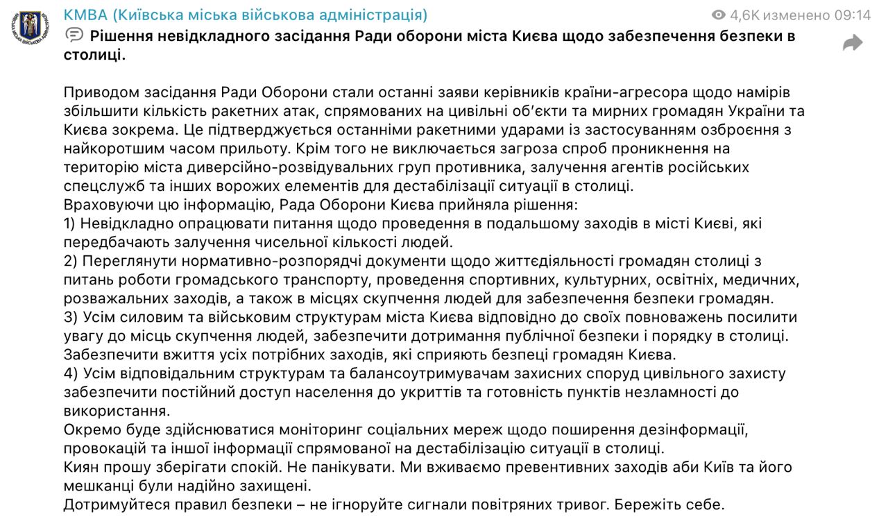 Из-за угрозы обстрелов и прорыва диверсионно-разведывательных групп (ДРГ) в Киеве проработают вопросы проведения в столице "мероприятий, которые предусматривают привлечение многочисленного количества людей".