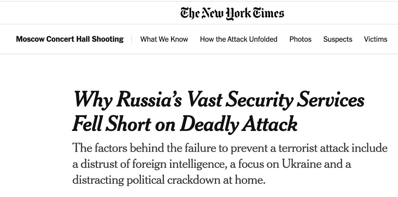 7 марта, на следующий день после того, как ЦРУ направила РФ частное предупреждение, ФСБ объявила, что убила двух казахов к юго-западу от Москвы, сорвав заговор ИГИЛ-К с целью атаковать синагогу в столице. Официальные лица США посчитали это возможным признаком, что российские власти приступили к действиям.