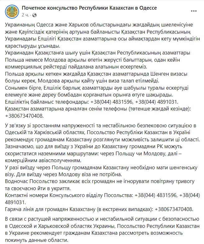 "В связи с растущей напряженностью и нестабильной ситуацией с безопасностью в Одесской и Харьковской областях Украины посольство Республики Казахстан в Украине рекомендует гражданам Казахстана рассмотреть возможность покинуть данные области", – говорится в тексте.