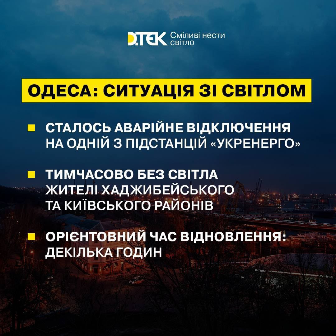 В то же время в Одессе аварийно отключилась подстанция, из-за чего без света остались жители Хаджибейского и Киевского районов, сообщает ДТЭК.