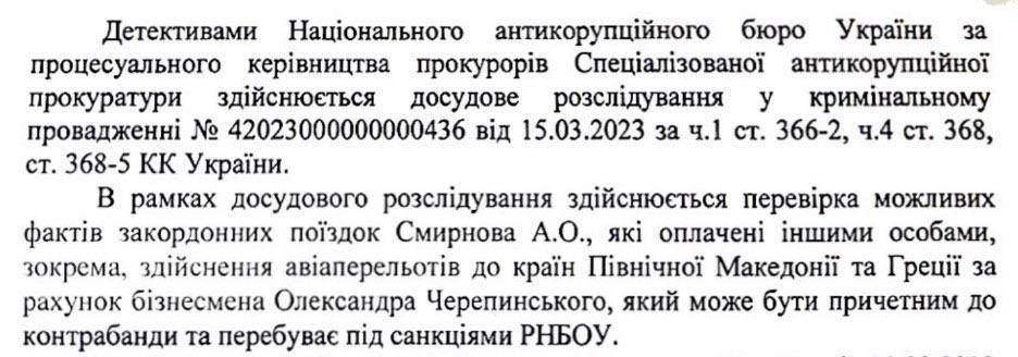 В том числе расследуется эпизод, связанный с опубликованным в СМИ фото, где Смирнов летит на частном самолёте с рядом попавших под санкции СНБО лиц (НАБУ расследует, кто оплатил этот перелет, который не был указан Смирновым в декларации как подарок). Также расследуется информация о том, что Смирнов мог помочь с выводом активов этих лиц накануне наложения на них санкций.