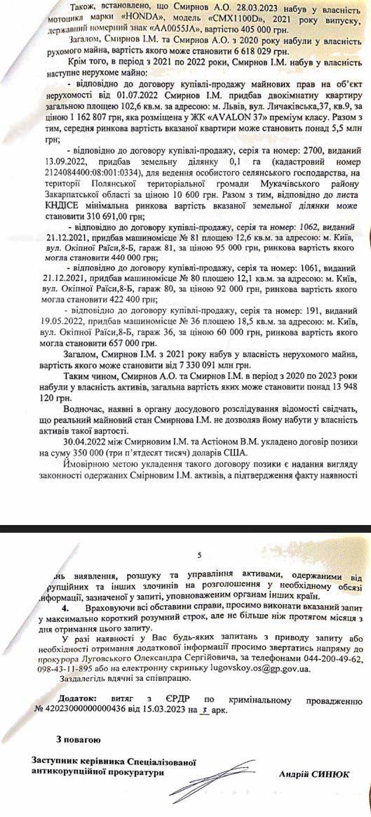 Что касается незаконного обогащения, то расследуют факт приобретения Смирновым и его братом движимого и недвижимого имущества в 2020-2023 годах на сумму почти 14 млн гривен.