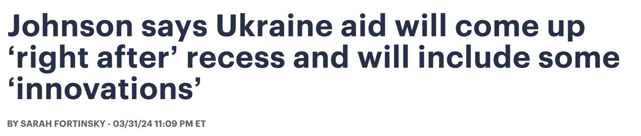 Спикер Палаты представителей Майк Джонсон заявил, что вынесет на голосование свой законопроект о помощи Украине "сразу после" каникул, которые заканчиваются 9 апреля.