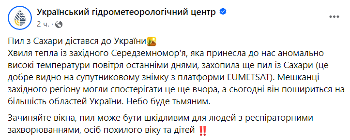 Об этом сообщает Укргидрометцентр на своей странице в Фейсбуке.