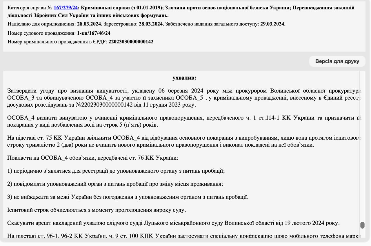 Жительница области вела канал "Волынь погода", в котором сообщала о местах выдачи повесток. В судебном решении приводятся подробности расследования. В документе говорится, что на канал было подписано 22,3 тысячи человек. С помощью чат-бота, в который пользователи канала слали места выдачи повесток, администратор канала получала информацию о местах выдачи повесток и публиковала эти сообщения.