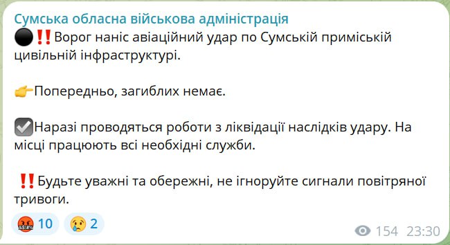 23.35 В Сумах авиаудар пришелся по пригородной гражданской инфраструктуре, сообщает местная ОВА.
